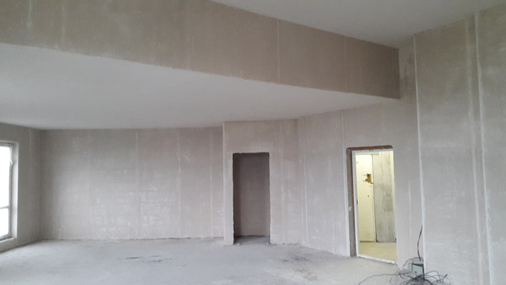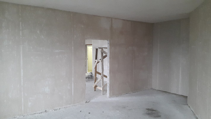 Для работы использовали смесь Knauf МП 75. Она отличается хорошей сцепляемостью с покрытием гладких стен, что делает ее идеальным вариантом в данном случае. Бригада из 3 человек справилась с работой за три дня. Для ванной дополнительно использовали цементную смесь и гидроизоляционную пропитку перед нанесением штукатурки. Наносился сразу один слой, толщина которого составила от 1 до 3-4 см.
