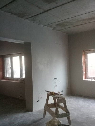 В марте 2019 года наша компания оштукатурила стены из кирпича в коттедже в п. Ильинское, 2010 года постройки. Выполнение работ заняло 5 рабочих дней. За это время бригада из 3 человек справилась с оштукатуриванием стен площадью 450 м2. Для работ использовалась смесь Knauf МП 75, благодаря гипсовой основе штукатурка быстро застыла и имеет лучшее сцепление с поверхностью кирпичных стен. Коридор коттеджа был узкий, что усложнило оштукатуривание и немного замедляло выполнение работ. Толщина слоя штукатурки на объекте составляла в среднем 2 см.